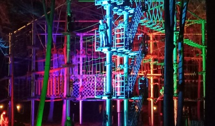 Het klimpark wordt sfeervol verlicht in een sprookjesachtige setting, wat zorgt voor een onvergetelijke uitdaging. …