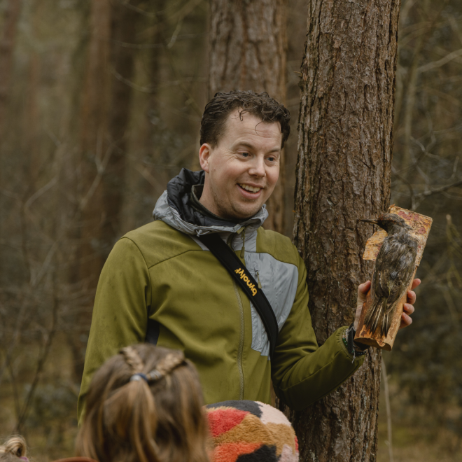 Bioloog Marijn neemt je 1,5 uur mee op avontuur in de natuur. Hij heeft niet alleen de leukste verhalen, maar ook allerlei materialen om samen te ontdekken wat er leeft in het bos.